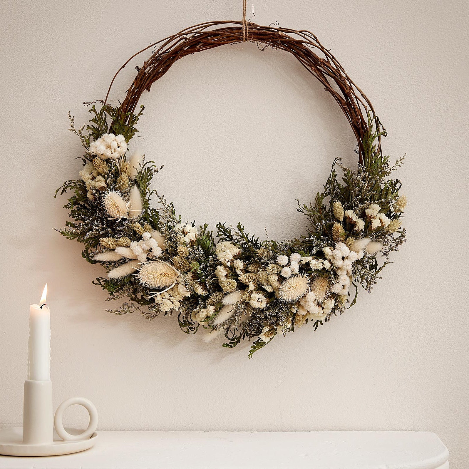- Recette florale : vigne, phalaris, cardos, statice, caspia, cèdre et lagurus blancs