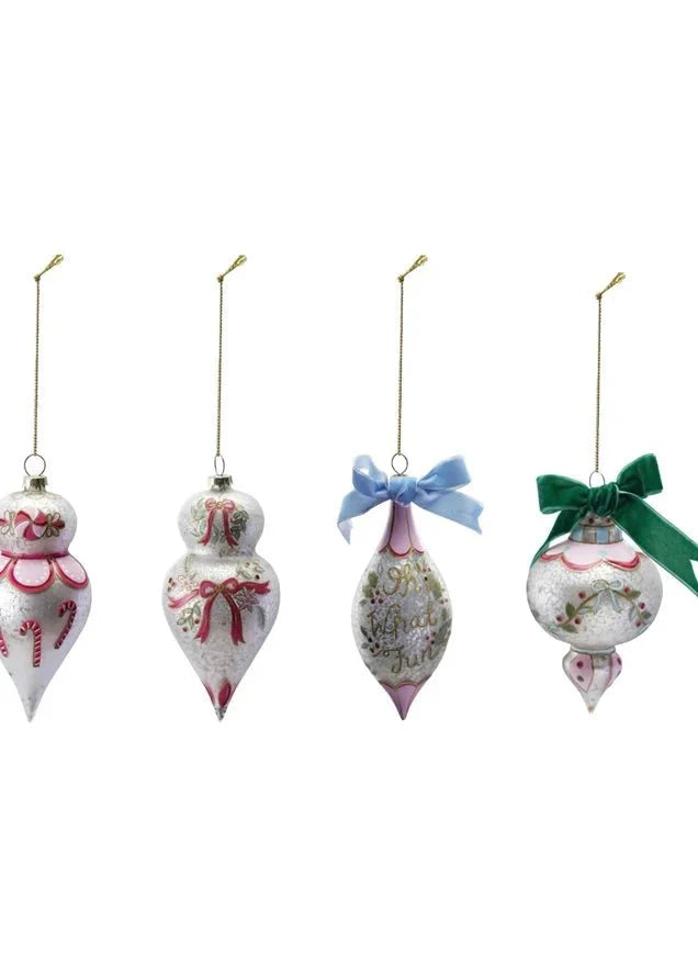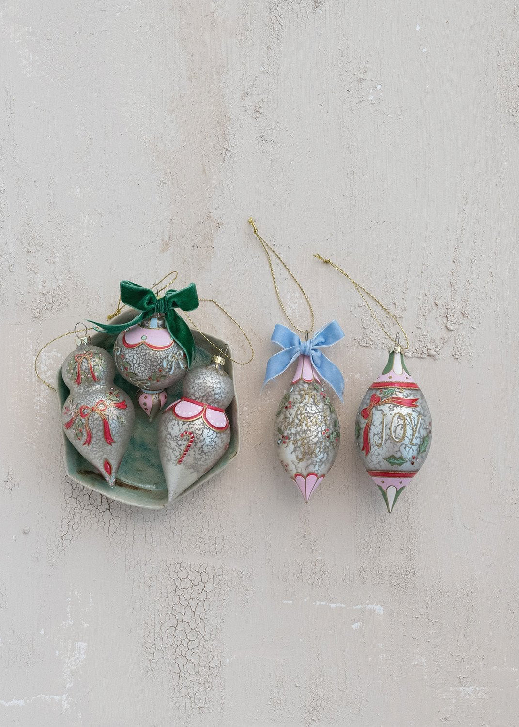 Délicatement façonnée et ornée d'une patine antique, cette décoration en verre peinte à la main semblera faire partie de votre collection de Noël depuis toujours. Chaque pièce est ornée d'un doux nœud en velours et peinte avec des détails intemporels, apportant juste ce qu'il faut de couleur et de charme féérique à votre décoration de Noël.