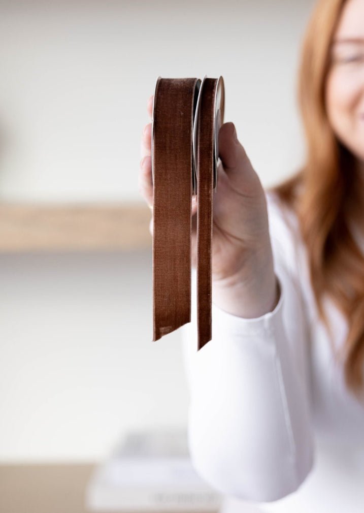 Notre ruban de velours marron est d'une beauté discrète, doux, naturel et d'un raffinement naturel. Confectionné avec soin et riche en texture, ce ruban apporte profondeur et chaleur à tout ce qu'il touche, des emballages cadeaux et couronnes de Noël à la décoration du quotidien. Sa teinte marron foncé s'harmonise parfaitement avec la verdure, le laiton et le lin, conférant à votre décoration de fêtes cette allure intemporelle et raffinée que nous adorons.