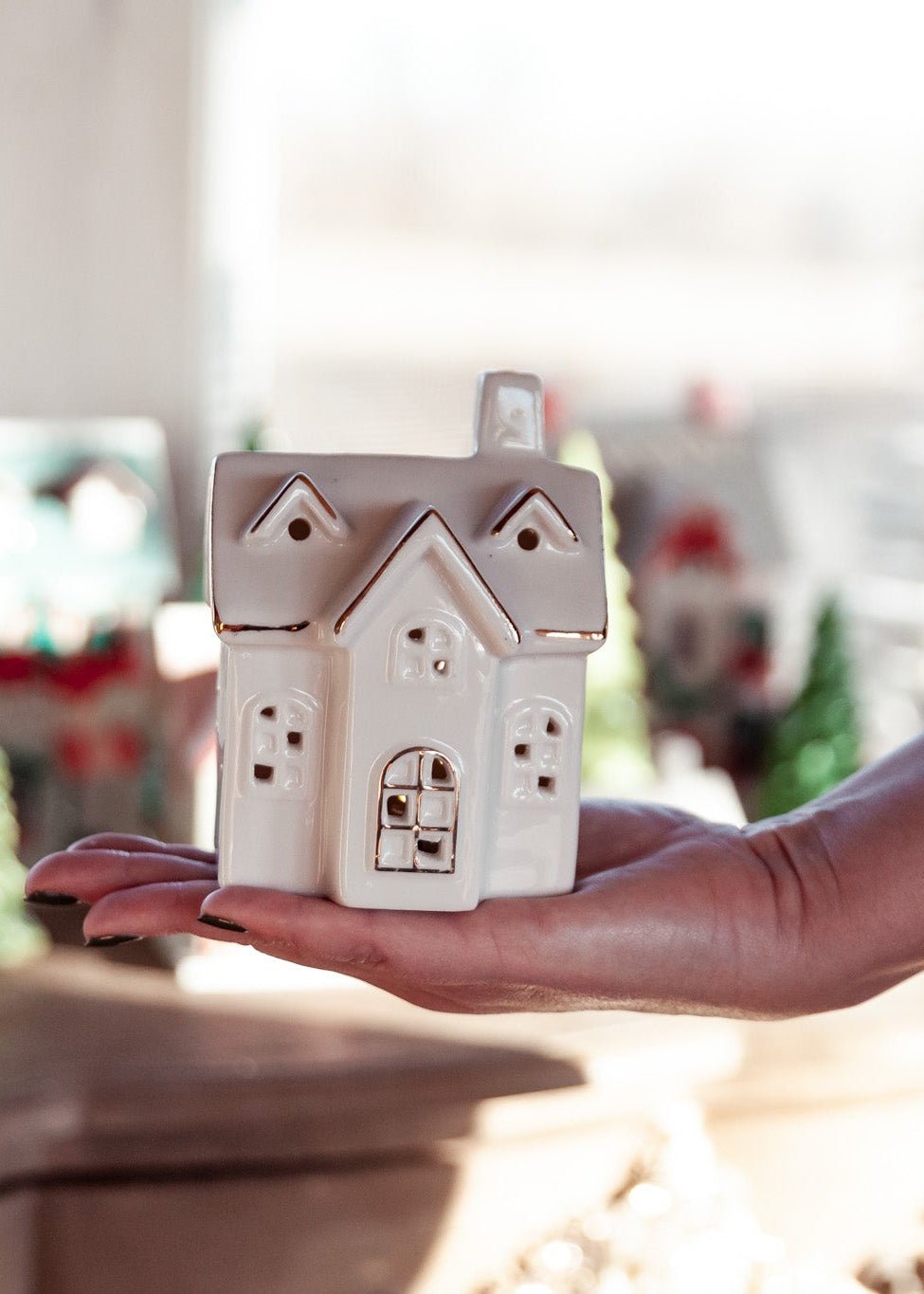 Notre village en grès avec lumières LED apporte une douce magie des fêtes à votre cheminée ou votre table. Cet élégant ensemble de quatre maisons en grès blanc doux est rehaussé de détails dorés électroplaqués et finis à la main, créant une lueur chaleureuse et intemporelle une fois illuminée.
